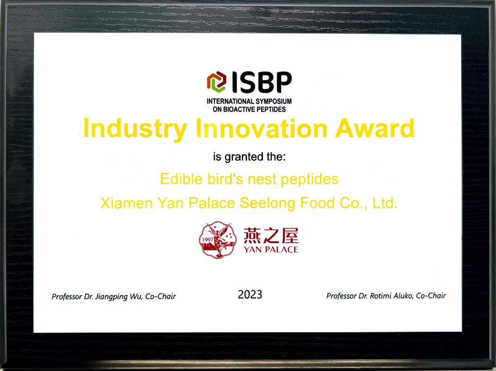 燕之屋多年來致力于燕窩肽的研發(fā),挖掘燕窩肽功效與價(jià)值。2022年1月,燕之屋正式成立燕窩肽研究中心,開拓品牌在燕窩肽酶解技術(shù)、活性成分與功能研究、消費(fèi)品研發(fā)、標(biāo)準(zhǔn)化等方向的新賽道,從制備工藝到活性研究均取得了顯著進(jìn)展和突破,多項(xiàng)研究成果刊登于國際權(quán)威期刊。憑借在燕窩肽技術(shù)創(chuàng)新、功能性開發(fā)及應(yīng)用轉(zhuǎn)化方面的成果與優(yōu)勢,燕之屋不斷獲得業(yè)界的認(rèn)可與嘉獎。2023年,燕之屋榮獲第三屆國際活性肽論壇“燕窩肽——行業(yè)創(chuàng)新獎”,該獎項(xiàng)肯定了燕之屋在燕窩肽研究領(lǐng)域的創(chuàng)新成果及其對行業(yè)發(fā)展的貢獻(xiàn),推動了燕窩行業(yè)向更高質(zhì)量方向發(fā)展。2024年,燕之屋燕窩肽榮獲“了不起的中國原料”中國創(chuàng)新原料獎Top10和中國王牌成分獎兩項(xiàng)殊榮,為國產(chǎn)燕窩原料的創(chuàng)新發(fā)展注入了新的活力,進(jìn)一步鞏固了燕之屋在燕窩肽原料開發(fā)領(lǐng)域的引領(lǐng)地位。