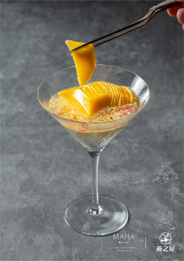 秋葵黃魚(yú)燕窩羹,燕窩經(jīng)凈水浸沐6小時(shí),換水滌塵,撕作雪絲隔水輕燉;黃魚(yú)淋開(kāi)水封鮮,煎至金黃生香,搗碎入滾水熬至濃白;秋葵片灼水,如玉簪點(diǎn)入羹中。這一盅融深海之鮮、燕窩之潤(rùn)、青蔬之清——沿襲古法,讓食養(yǎng)同源的美味在舌尖化開(kāi)。發(fā)酵酸湯龍蝦趴燕窩汁,龍蝦肉冷腌15分鐘,裹上特調(diào)漿粉炸出金黃蜂巢脆衣,咬下時(shí)“咔嚓”聲如秋葉碎響。番茄經(jīng)自然發(fā)酵成琥珀酸湯,澆淋現(xiàn)燉燕窩汁——酸鮮激蕩中,燕窩柔滑如綢緞?chuàng)徇^(guò)舌尖,是主廚獻(xiàn)給味覺(jué)的冒險(xiǎn)詩(shī)篇。芒果酒釀桂花蜜蛋糕配新鮮芒果及燕窩:“燕窩需隔水輕蒸,裹住桂花蜜的魂。”主廚將酒釀熬作凝脂奶凍,托起卡曼橘芒果慕斯的俏皮酸香。頂層燕窩如琉璃凍雨,新鮮芒果是點(diǎn)睛明月。撒入桂花,取“蟾宮折桂”的好兆頭。當(dāng)瓷勺探底——酒釀的醇厚、慕斯的輕盈、燕窩的滑潤(rùn)在口中共譜秋月的詩(shī)篇。