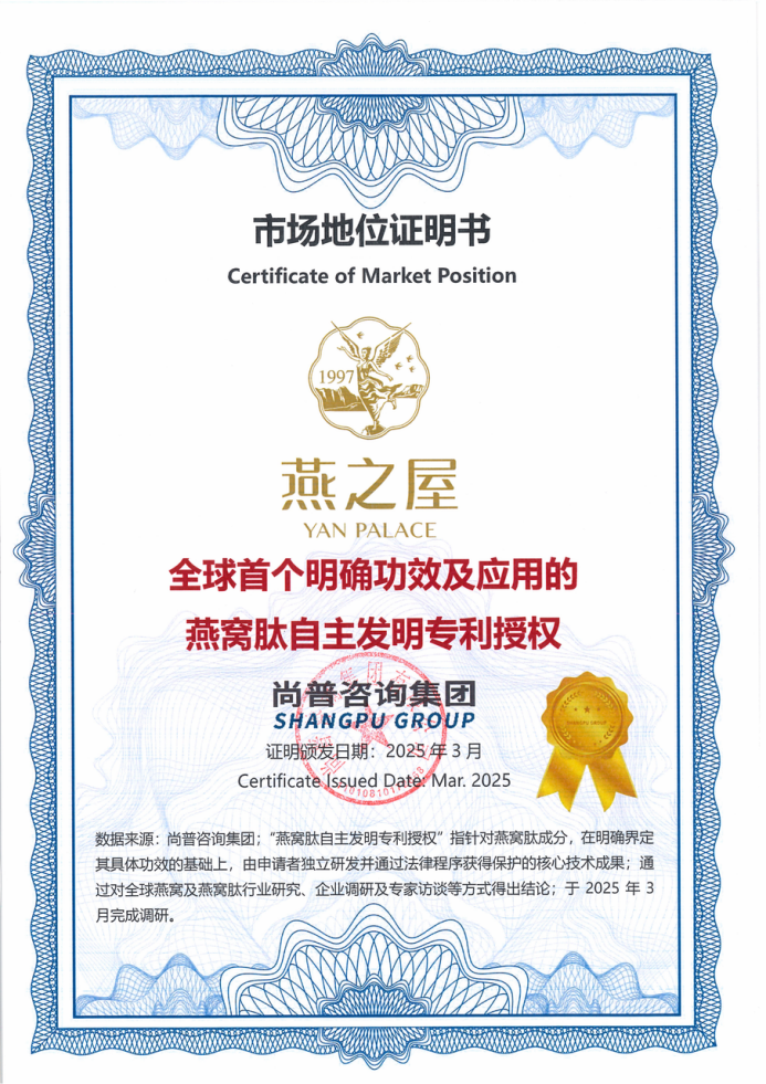 圖:燕之屋獲得“全球首個明確功效及應(yīng)用的燕窩肽自主發(fā)明專利授權(quán)”認證